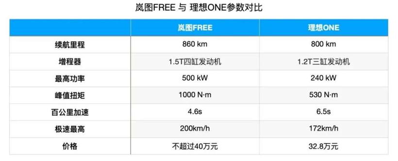 这意味着,作为后来者的岚图FREE,在NEDC续航里程、最高功率、百公里加速上均超越了最早采用增程式的理想ONE。相比之下,理想ONE的NEDC续航里程为800公里,最高功率为240kW,峰值扭矩达530N·m,百公里加速为6.5s,极速最高可达172km/h。