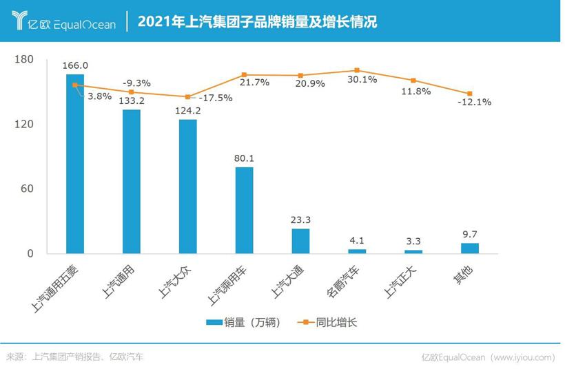 亿欧汽车了解到,在上汽集团的自主品牌中,荣威和MG品牌合计销量约为80万辆。上汽通用五菱2021年销量166万辆,同比增长3.8%,成为2021年度上汽集团销量贡献最大的子公司。