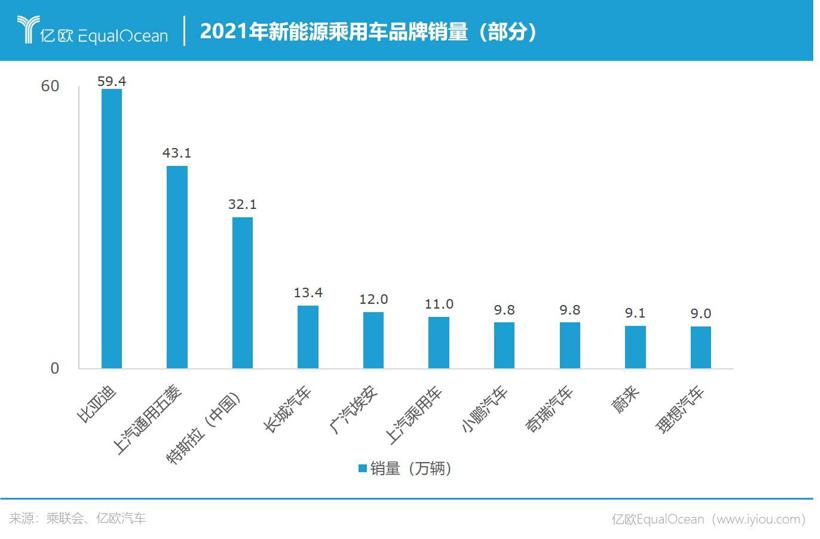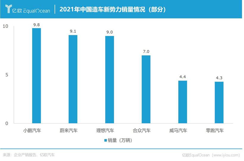 新能源乘用车年销售量破10万的整车厂还有长城汽车、广汽埃安和上汽集团。造车新势力中,小鹏汽车、蔚来、理想汽车的销量分别为9.8万、9.1万和9万辆,分别位于第7、9、10位。