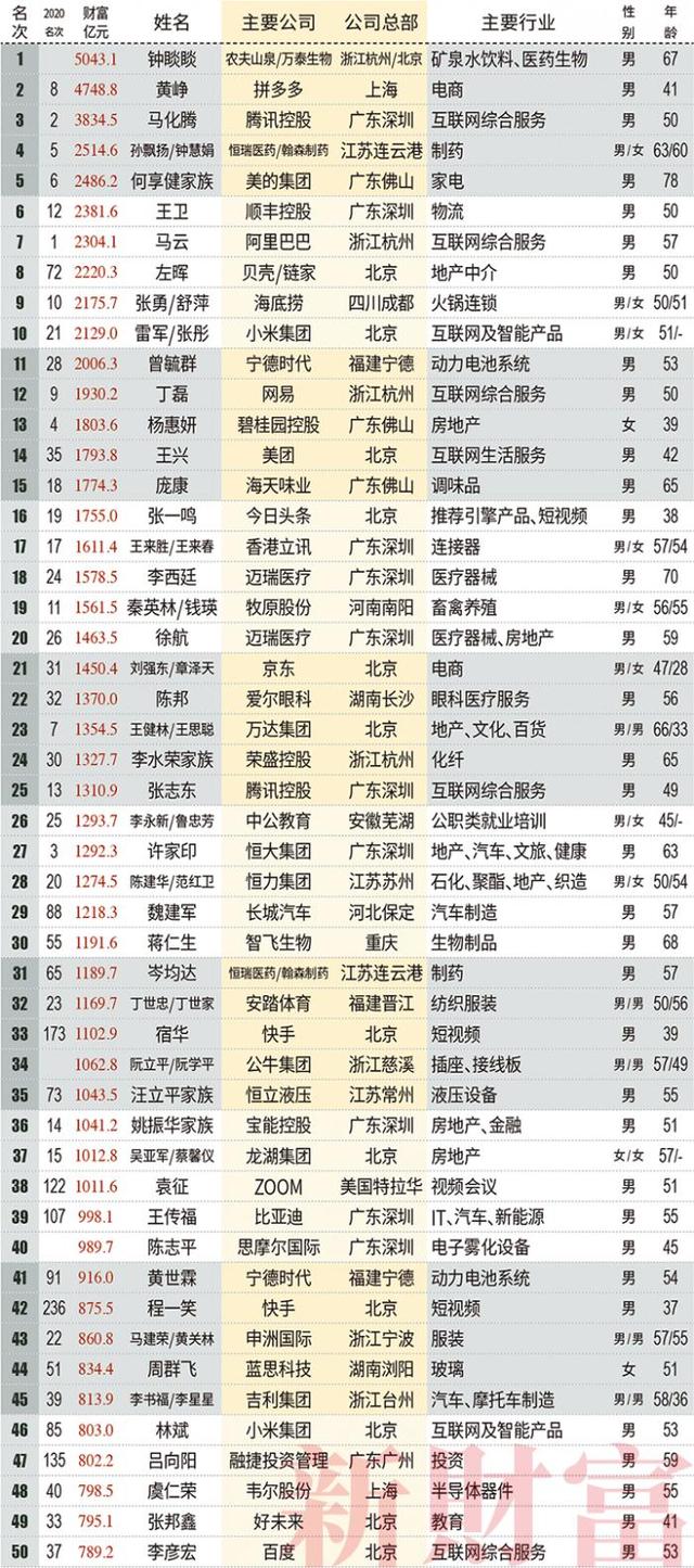 分别是排名第27位的许家印,财富达1292.3亿,此前排名第3位;排名第29位的魏建军,财富达1218.3亿元,此前排名第88位;排名第39位的王传福,财富达998.1亿元,此前排名107位;排名第45位的李书福/李星星,财富达813.9亿元,此前排名39位。