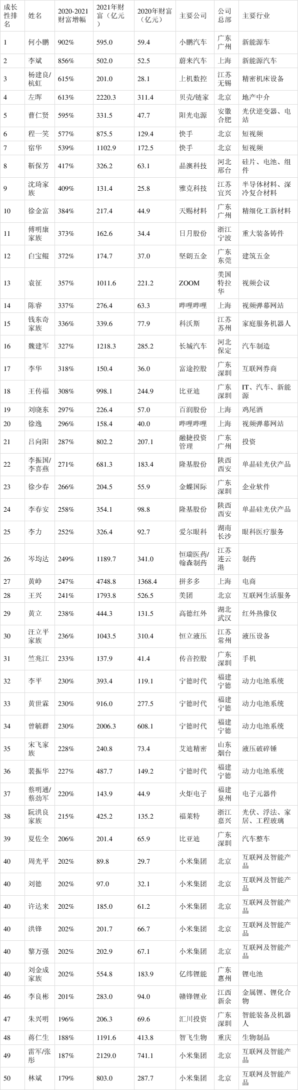 值得被关注的是,据新财富发布的“2020-2021财富最快成长50人”榜单显示,小鹏汽车创始人何小鹏财富增幅达到902%,至595亿元,排名第一;蔚来汽车创始人李斌财富增幅达856%,至502亿元,排名第二。