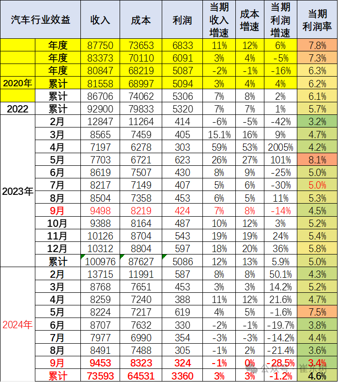 其实,由于价格战的持续和愈演愈烈,不仅是9月,三季度乃至今年全年汽车行业的利润都大幅减少。相关数据显示,2020年汽车行业利润率为6.2%,2021年为6.1%,2022年为5.7%,2023年为5.0%,均高于今年1-9月的4.6%。