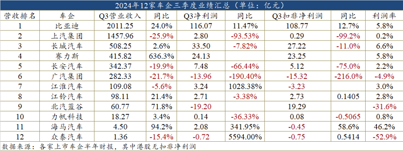 通过一句话点评对13家国内主要上市车企财报的整理发现,虽然三季度有7家的营收都有不同程度的增长,比如赛力斯是去年同期的6倍还多,但其余车企营收都出现不同程度的下跌,同时它们的净利润更是遭受“重创”,比如上汽的净利润和扣非净利润跌幅都超过90%,广汽两项净利润指标还直接转为负数,真可谓冰火两重天。