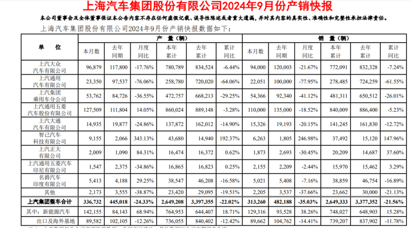 更惨烈的是,三季度上汽的归母净利润和扣非净利润都同比下跌超过90%,两者分别仅剩只剩2.80亿元和0.29亿元。受到三季度的拖累,今年前三季度上汽的累计净利润和扣非净利润也分别下跌39.45%和88.9%。对此,上汽在财报中称,主要是因为燃油车市场下滑、价格战激烈,导致公司销售收入减少。