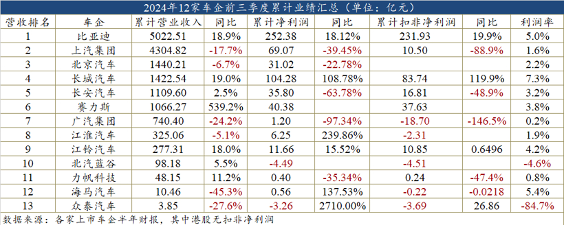 综上可知,尽管今年三季度国内汽车市场已经明显回暖,但受到价格战的影响, 13家国内上市车企中只有比亚迪和赛力斯的营收和净利润指标较好,其余车企或营收或净利润,甚至两项指标均遭受不同程度的减少。