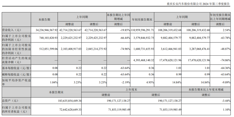 在累计榜单中紧跟长城汽车的是长安汽车,前三季度营收同比小幅增长2.5%至1109.60亿元,归母净利润和扣非净利润分别下跌63.78%和48.9%。