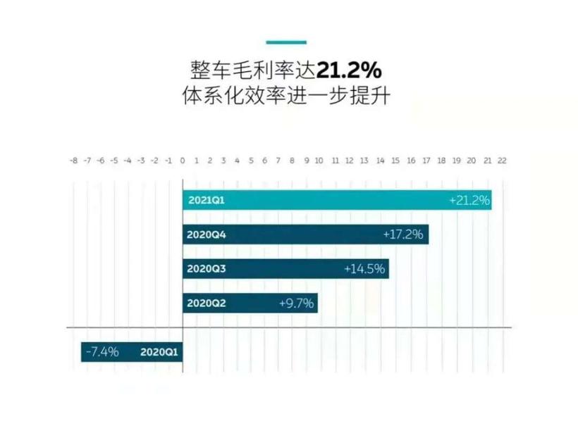 2021年一季度,蔚来整车销售毛利率达21.2%,综合毛利率达19.5%。这两个数据较2020年四季度分别提升4个以及2.3个百分点。据李斌在财报电话会议上介绍,“这是源于一季度交付量上涨,平均成交价略有提升。同时,成本有一些下降。”