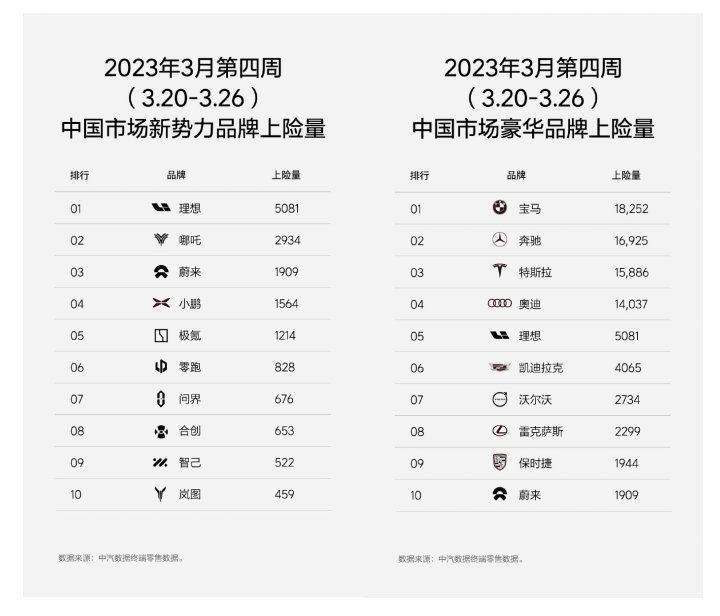 3月29日,理想汽车官方微博公布,在3月第四周(3.20-3.26),理想汽车周上险量达到5081辆,远超其他新势力品牌;同时,理想上周也成功跻身中国市场豪华品牌上险量前五,是榜单中排名最高的中国品牌,超越了BBA以外的其他传统豪华品牌。
