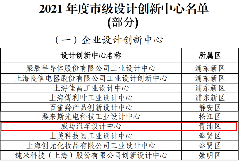 .上海市经信委根据国家级工业设计中心标准,宣布威马汽车获评“市级设计创新中心”。威马汽车成为2021年度唯一获得该称号的车企。