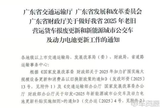 6. 3月11日,广东省交通运输厅、广东省发改委、广东省财政厅联合下发通知,推进2025年老旧营运货车报废更新和新能源城市公交车及动力电池更新工作。