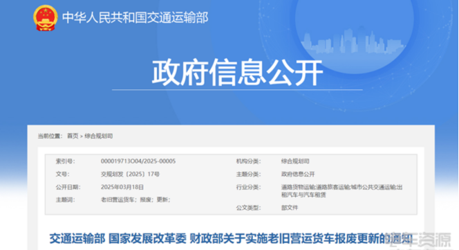 2. 3月18日,交通运输部、国家发展改革委、财政部联合发布实施老旧营运货车报废更新的通知,通知明确加快报废高耗能高排放老旧货车,对老旧营运货车报废更新给予资金补贴。补贴政策实施期限为2025年1月1日至2025年12月31日。