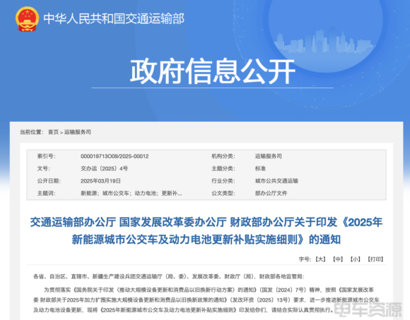3. 3月19日,交通运输部办公厅、国家发改委办公厅、财政部办公厅印发《2025年新能源城市公交车及动力电池更新补贴实施细则》,对补贴范围和标准、补贴申报、审核和发放等作出明确。