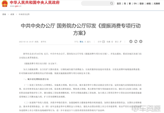 1. 3月16日,中共中央办公厅、国务院办公厅印发《提振消费专项行动方案》(以下简称《方案》),以“增收、提质、惠民、创新”为主线,部署八大行动30项任务,为2025年经济增长注入强劲动能。这是继全国两会后,中央针对扩大内需、激活消费市场释放的重磅信号。