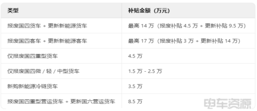 报废更新新能源车辆国四及以下排放标准老旧货车或大中型客车报废,并更新为新能源车辆的车主。(例如:报废国四大型客车 + 购买新能源大型客车,最高可获17万元补贴)仅报废国四货车仅报废国四排放标准老旧货车的车主(新增微、轻、中型货车补贴)。新购新能源冷链货车取得道路运输经营许可的业户,新购置新能源冷链货车。