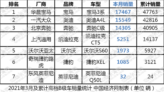 从一季度的市场销量分析来看,轿车的整体增速介于SUV和MPV之间,而合资B级车的“马太效应”日趋明显,以高档B级车为例,奔驰C级、宝马3系和奥迪A4L的累计占比进一步扩大,排名4-7位的竞品总量尚不及销冠宝马3系的一半,而在五年前,它们的总和是与BBA中单一车型是旗鼓相当的。