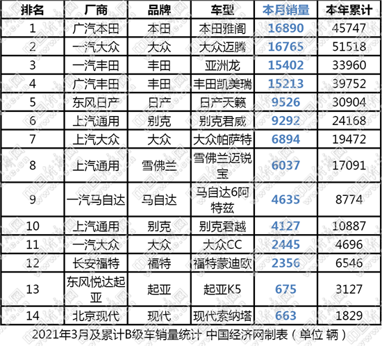 在普通品牌中,合资B级车相比去年,一季度的整体排名出现了重大变化。先是迈腾“王者归来”,相比去年一整年的平淡表现,今年一季度率先“破局”,目前累计销售超5万辆,夺得细分市场冠军;其次是亚洲龙的持续攀升,3月销量已力压凯美瑞,进入三甲序列,一季度累计销量排名第四;最后就是帕萨特的陨落,“碰撞门”事件虽然已过去了一年半的时间,但潜在的影响不容小视,因为旗舰受损,上汽大众在今年一季度的市场表现同样差强人意。