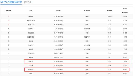 根据某网站统计的5月MPV销量榜,排名前15的车型中,仅有小鹏X9和奔腾NAT仅有纯电版本,尽管小鹏X9凭借着下放的豪华配置和热度,最后成了纯电MPV的销冠,但是月销量也仅为1625辆,和排在榜单前列的腾势D9、丰田赛那、别克GL8等车型的销量仍有不小的差距,可见纯电MPV市场的艰难。