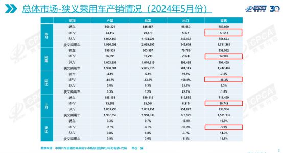 根据乘联会的数据,在2024年5月,MPV车型的零售销量为77613辆,同比下滑18.3%,环比下滑3.9%。