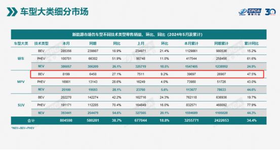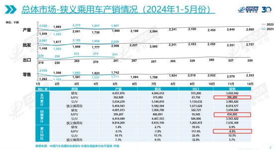 在2024年1-5月,MPV车型的零售销量为396209辆,相比去年同期的434266辆,同比下滑了8.8%。