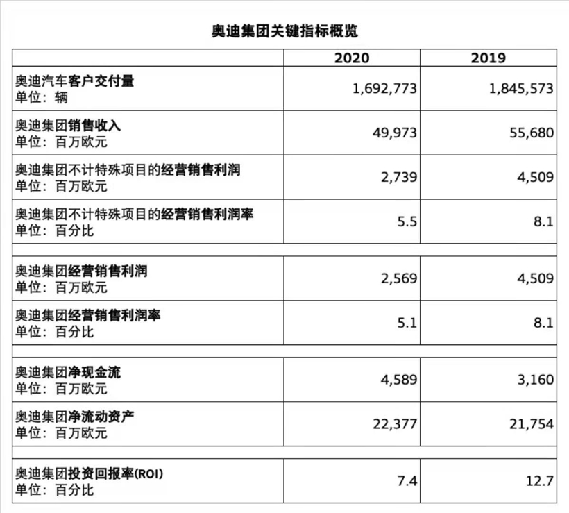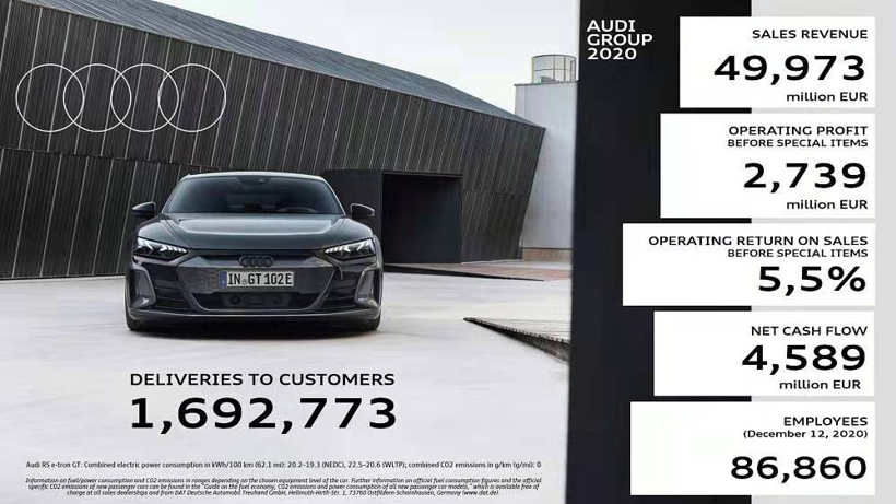 奥迪集团2020财年的销售收入达499.73亿欧元(2019年:556.8亿欧元)。不计特殊项目,经营销售利润为27.39亿欧元(2019年:45.09亿欧元)、经营销售利润率为5.5%(2019年:8.1%)。