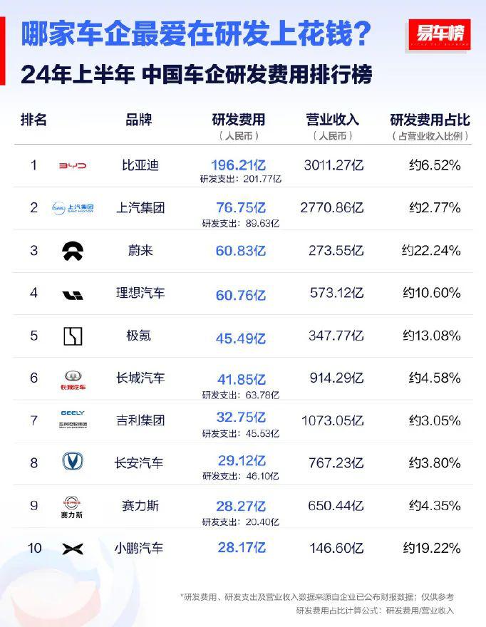 2024年,自主头部车企的平均研发投入占比为4.76%,远超行业平均水平的3.15%。其中,吉利汽车的研发投入占比为4.24%,长城汽车为6.97%,奇瑞汽车为5.13%,比亚迪的研发投入更是达到了14.8%......这些数据表明,头部车企正通过加大研发投入来提升竞争力。