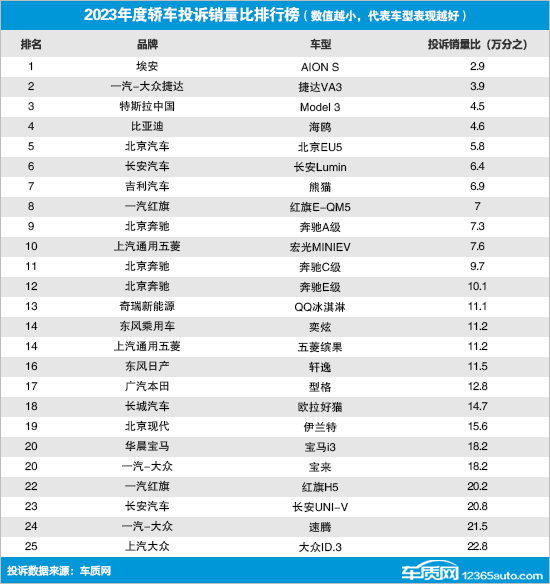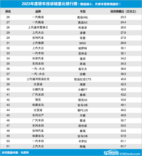 据缺陷汽车产品信息收集平台车质网的统计数据显示,2023年国内汽车年度投诉销量比均值为万分之51.5,数值较2022年有明显提升,侧面反映出汽车整体口碑正在持续转差。其中,轿车投诉销量比年度均值为万分之61.8,表现不及同期汽车整体水平。据乘联会数据显示,2023年轿车累计销量共10,246,233辆,其中有销量数据的车型共230款,由此得出轿车年销量平均值为44,548辆。据统计,2023年共有65款车型超过了轿车年销量平均值,其中51款车型因投诉销量比表现优于轿车投诉销量比年度均值而入选榜单,具体排名如下: