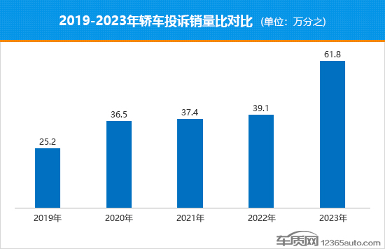 从近五年轿车投诉销量比数值变化可以看出,整体呈现出逐年增长的态势,并且在2020年和2023年两次迎来跨越式增长,其中2023年更是首次突破万分之60,达到历史新高点。
