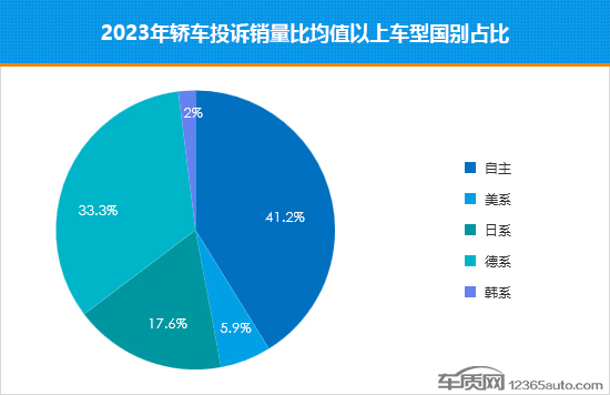 从2023年度轿车投诉销量比均值以上车型的国别占比来看,自主品牌车型占比再次出现缩水,与2022年相比降低了6.8个百分点。此外,美系和日系品牌入榜车型数量均较2022年有所下降。而德系品牌入榜车型相比2022年增加了6款,占比提高了11.3个百分点。