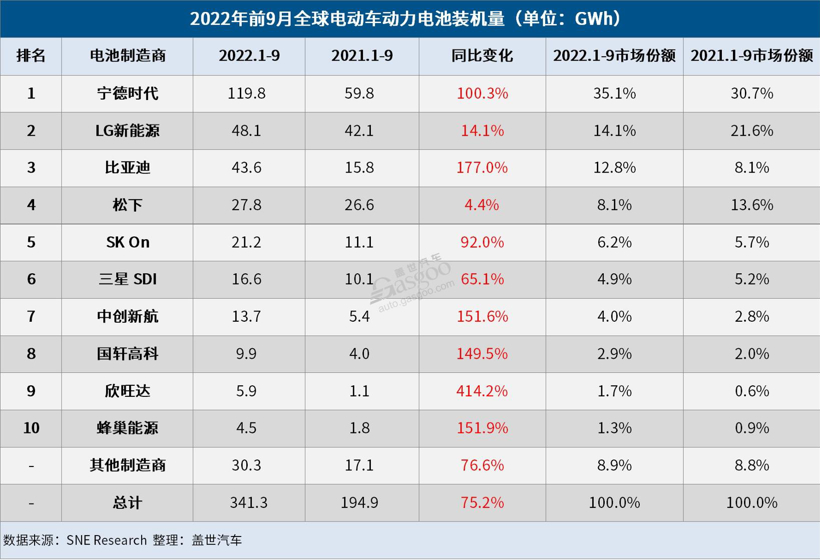 2022年1月至9月,全球电动汽车电池装机量达到341.3 GWh,同比增长75.2%,继续维持了自2020年第三季度以来的增长趋势。