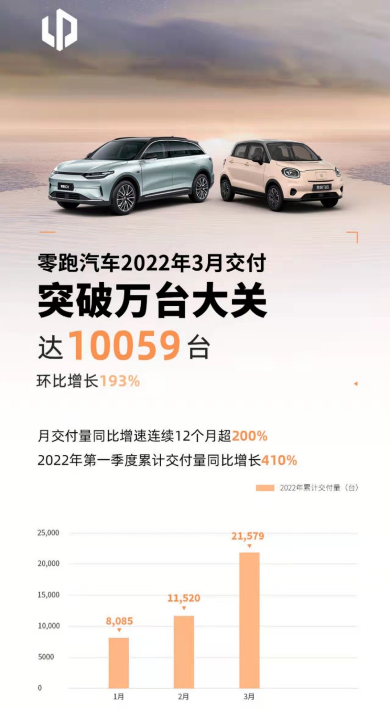 随着3月交付量的出炉,零跑汽车2022年第一季度累计交付量也随之呈现。数据显示,零跑汽车今年一季度交付量已超2.1万辆,同比增长410%。另据零跑汽车官方透露,其月交付量同比增速已连续12个月超过200%。由此来看,作为原二线新势力的代表,零跑汽车近一年来以较高的增速向第一阵营老手发起进攻。今年3月,零跑和哪吒的月交付量双双挤进万辆俱乐部,这也意味着诸多原二线新势力开始拿到跻身第一阵营的“入场券”。
