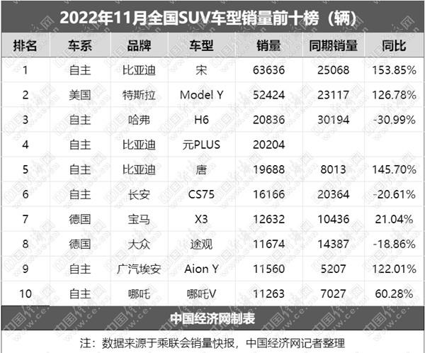 另外两款入榜SUV销量前十的新能源车型虽仅排名榜单末尾,但都是从未入过榜的新面孔。11月,广汽Aion Y售出11560辆,同比增长122.01%,排名第9。曾几何时,广汽传祺GS4也是自主SUV中的佼佼者,但自其陨落后,广汽阵营中几乎再无响当当的明星SUV产品,而Aion Y的崛起,或将助力广汽的自主事业实现突破。
